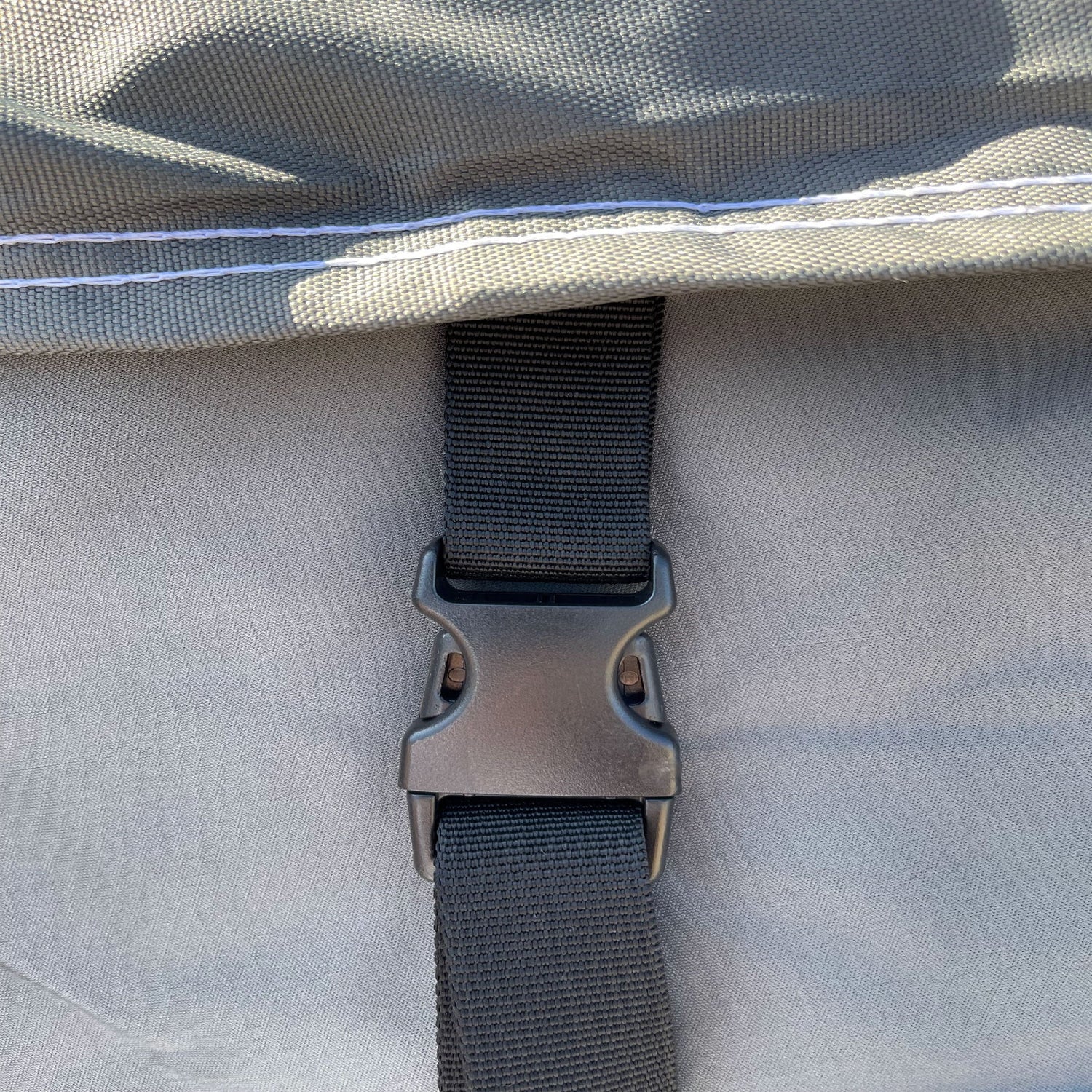6-Way Buckle System: Powerful webbing straps and tough buckles are sewn into every cover to hold the cover down in high winds and storms, providing unmatched security. This seamlessly sewn 6-way buckle system offers not only extra security but also flexibility. Inside the box, you'll find the additional strap designed to extend from the top to the bottom of your car, ensuring comprehensive coverage and fortification against the most challenging conditions. This thoughtful addition grants you the peace of mind that your OutdoorX cover stays firmly in place, ready to protect your vehicle at all times.
